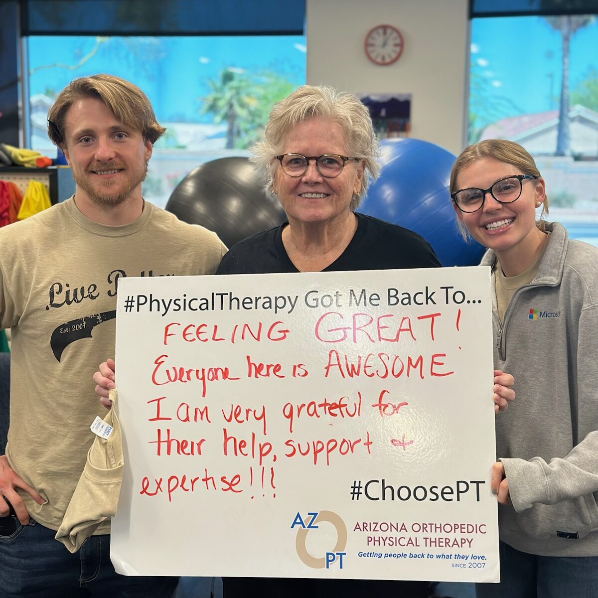 AZOPT (Arizona Orthopedic Physical Therapy) is an outstanding Physical Therapy Clinic. The Therapists and supporting staff here are understanding and very professional people. I’ve been in their care for more than two years with excellent results. Unfortunately, my care will continue for the rest of my life. I feel fortunate to have this quality Clinic to help me.