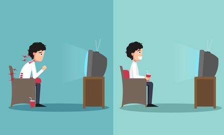 If you sit for more than 1 hour during the day, it is recommended to get up every 30 minutes to stretch, walk and drink some water. We were not designed to sit. The body is a perpetual motion machine. When you’re sedentary, your muscles get less oxygen and nutrients from your blood. Try to keep your chest out and shoulders back, and pull your chin back so your head is centered over your shoulders while sitting and standing. Develop the habit of squeezing your shoulder blades together several times per day to train yourself not to slouch.